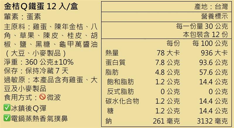 將水煮蛋與陳年金桔滷成,使尾韻回甘助消化,有別於其他滷時程長的鐵蛋,桔Q蛋經特製烤箱智慧溫控,高溫烘烤數小時至外皮呈焦糖色,蛋皮不乾硬好入口,口感香Q 彈牙。