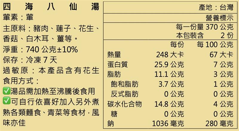 食用說明:請置入冰箱冷凍,食用前需放入可加熱容器,以電鍋、微波爐或瓦斯爐加熱,亦可加入個人喜愛的熟食(如:各式麵食、冬粉、各類青菜等)一同食用,別具風味。